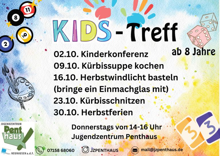 Die ersten Schultage sind bereits hinter Dir und Du hast Dich gut eingefunden im neuen Schuljahr. Der Kids-Treff startet wieder und alle Kids ab 8 Jahren sind wieder herzlich eingeladen am abwechslungsreichen Programm teilzunehmen. Schon vormerken: Halloween Kids- und Teeniedisco am 24.Oktober!