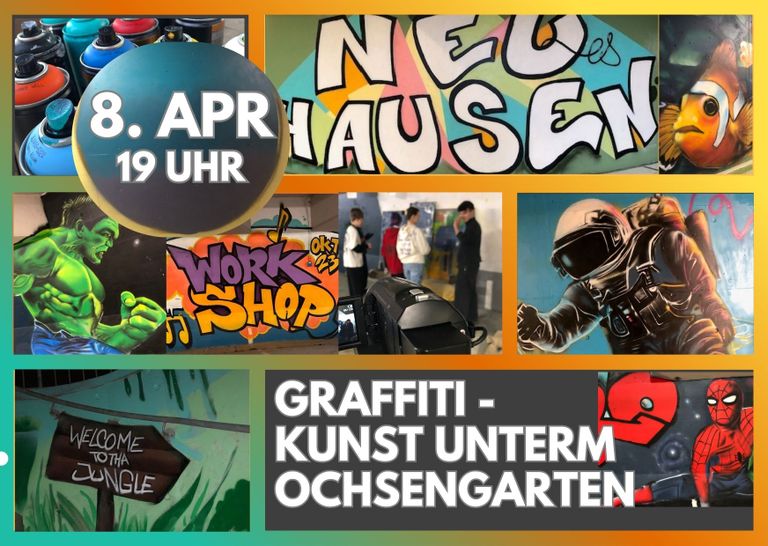 Einweihung der Graffitikunst in der Tiefgarage unterm Ochsengarten. Ab 7. April startet der letzte von insgesamt 7 Workshops zur Gestaltung der Tiefgarage und dauert bis zum 10.04. Nathan Grant als Profi garantiert wieder beste Ergebnisse. Am 8. April findet die offizielle Einweihung statt. Herr BM Hacker wird ein Grußwort beitragen. In lockerer Atmosphäre mit Musik und einem kleinen Imbiss können die Kunstwerke betrachtet werden. Wir bieten kommentierte Führungen an.
